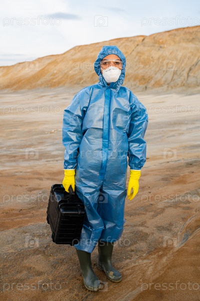 Молодой исследователь в области защитной рабочей одежды держит чемодан с образцами, стоя на загрязненной почве