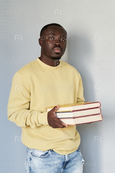 Портрет серьезного красивого чернокожего студента-мальчика в желтой свитерке, стоящего с кучей книг на сером фоне