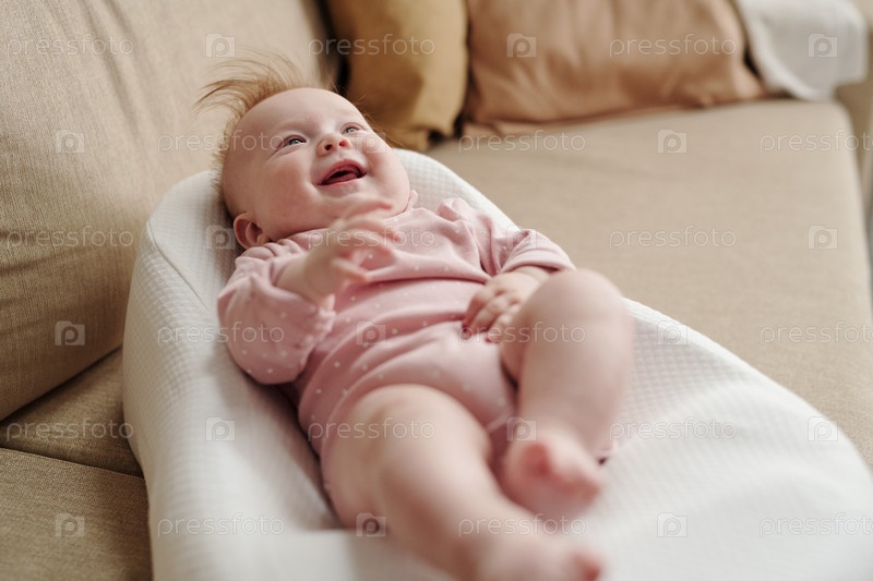 Счастливая девочка смеется, лежа в маленькой кровати на диване
