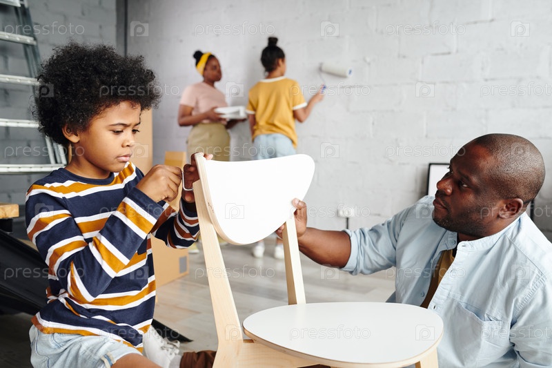 Маленький мальчик помогает отцу собрать стул, закрепляя свою спину на матери и сестре