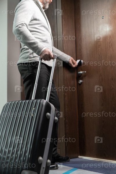 Современный зрелый бизнесмен или путешественник с багажом, использующий карту для открытия двери гостиничного номера