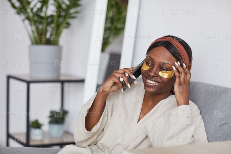 Улыбающаяся молодая женщина разговаривает по телефону дома