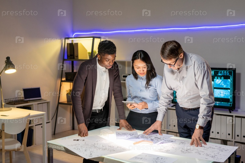 Команда дизайнеров обсуждает эскизы автомобильных моделей