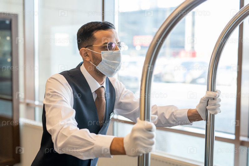 Молодой носильщик в форме, очках и защитной маске толкает тележку с багажом по коридору