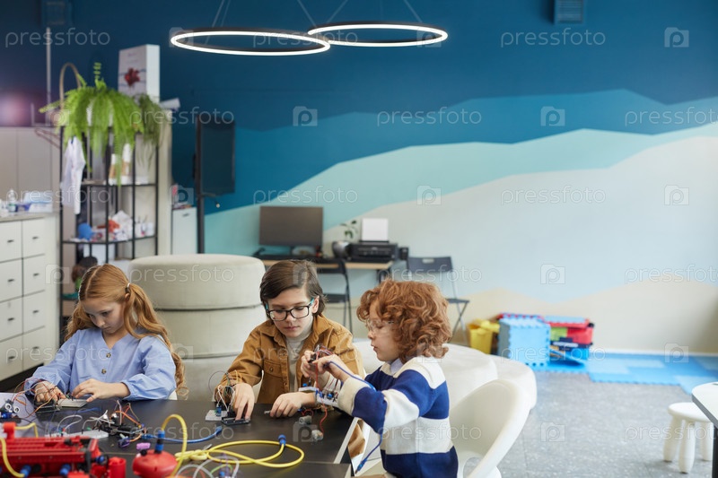 Группа детей, строящих роботов в школе