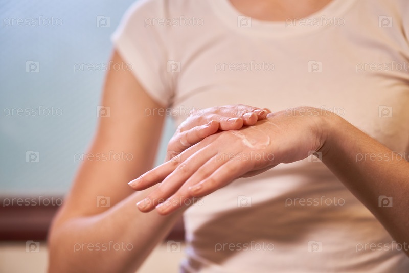 Женщина наносит лосьон на руки