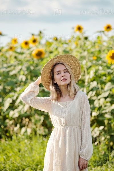 Красивая молодая блондинка в соломенной шляпе и белом платье стоит на улице