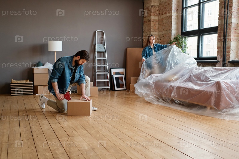 Горизонтальный длинный снимок молодого человека и женщины, которые готовятся переехать в новую квартиру, упаковывают вещи в коробки и обертывают мебель