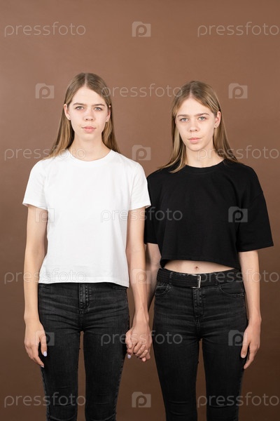 Двойняшки в бело-черных футболках, держащиеся за руки
