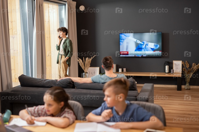 Молодая бизнесвумен разговаривает по мобильному телефону, пока ее муж смотрит новости