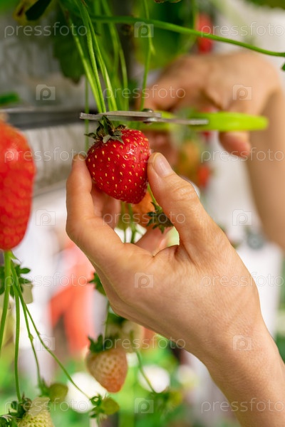 Рука женщины-фермера, держащей клубнику во время ее резки