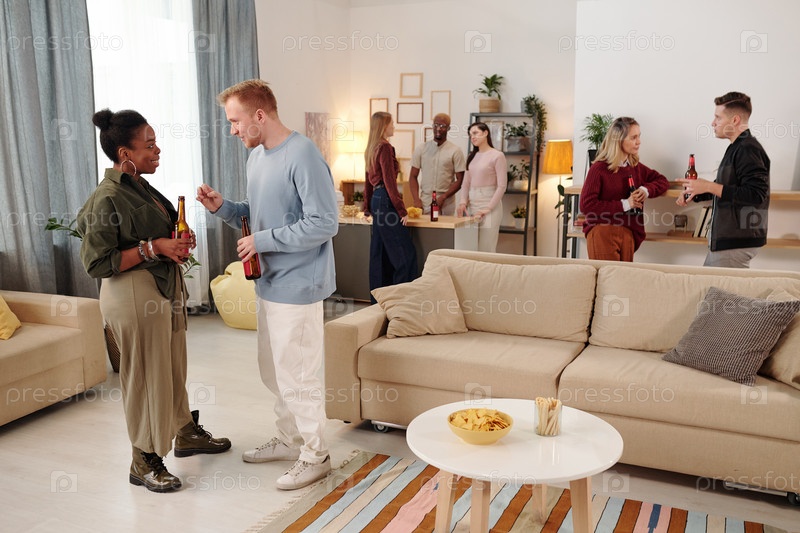 Счастливая молодая межкультурная пара с бутылками пива наслаждается домашней вечеринкой