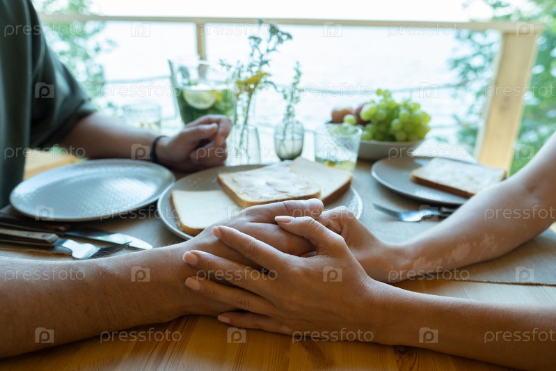 Руки молодой ласковой пары, сидящей за обслуживаемым столом