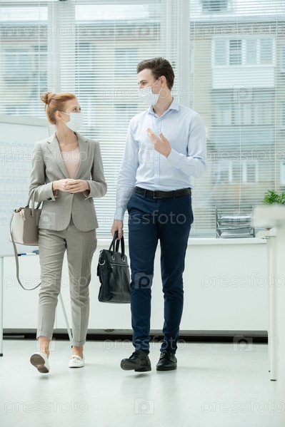 Молодые современные менеджеры в защитных масках беседуют, покидая офис
