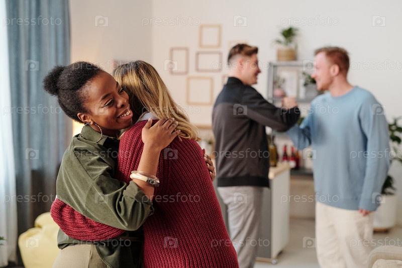Счастливая молодая африканская женщина в умной повседневной одежде обнимает парня в синем пуловере