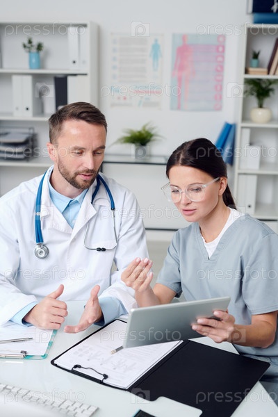 Два молодых клинициста в форме обсуждают онлайн-информацию на дисплее планшета