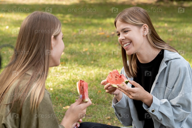 Две милые девочки-подростки, которые едят арбуз во время отдыха в парке