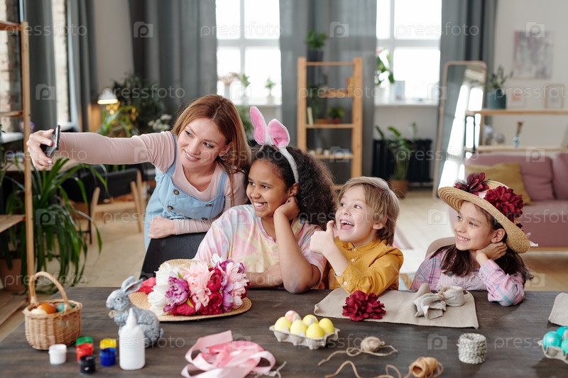 Трое милых маленьких детей и молодая блондинка в повседневной одежде делают селфи