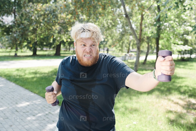 Мужчина тренируется с гантеликами на открытом воздухе