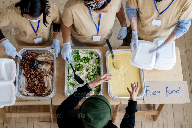 Группа волонтеров раздает контейнеры с бесплатной едой нуждающимся людям