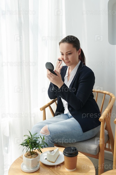 Деловая женщина наносит на лицо порошок