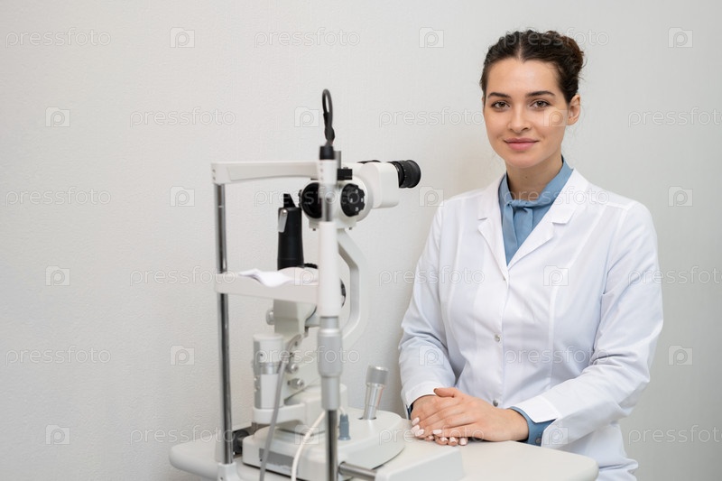 Молодая улыбающаяся офтальмолог-женщина в белом халате сидит перед камерой