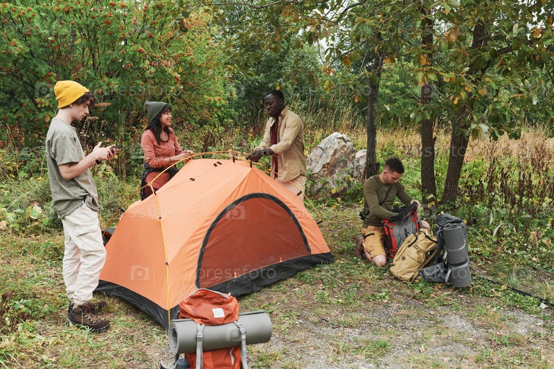 Группа молодых многоэтнических туристов, беседующих и устанавливающих палатки вместе в лесу