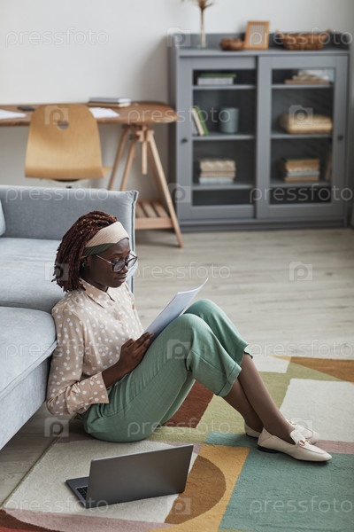 Афроамериканская женщина наслаждается расслабляющей работой из дома