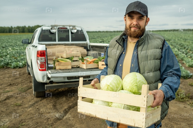 Счастливый молодой фермер с урожаем капусты стоит против поля и машины
