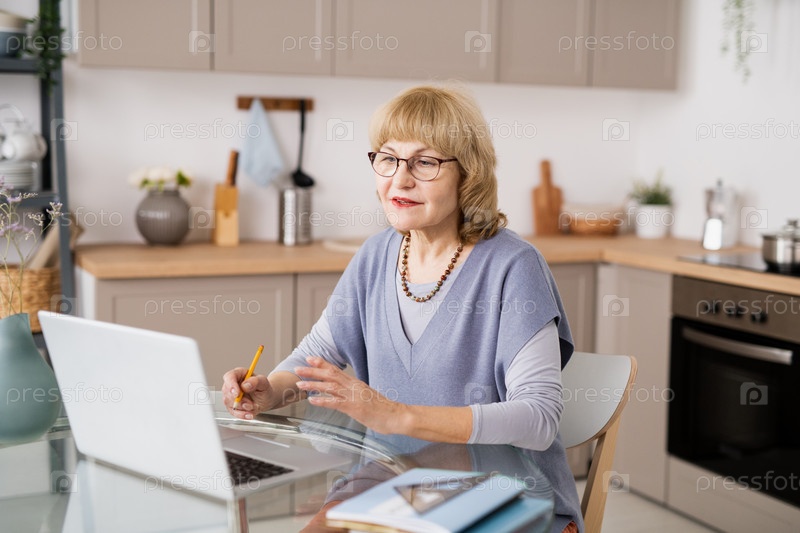 Современная зрелая женщина, сидящая перед ноутбуком у кухонного стола