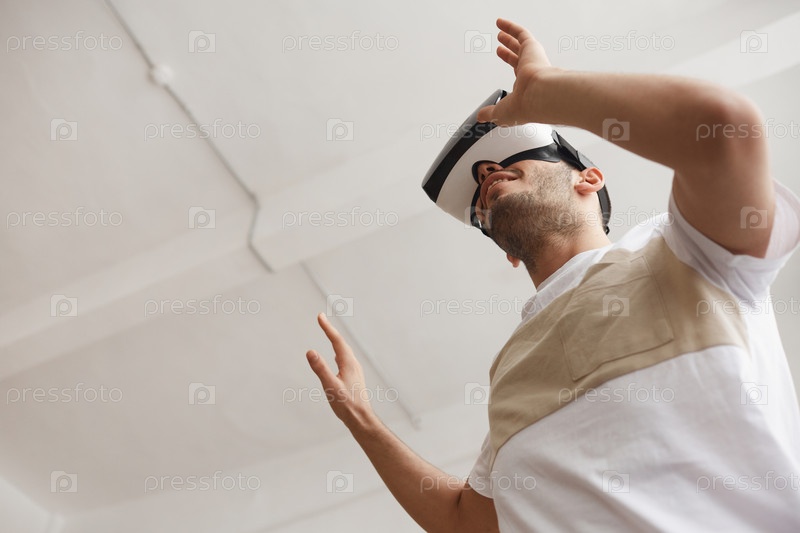 Молодой человек играет в VR дома под низким углом