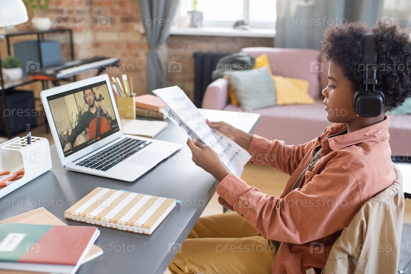 Милый мальчик с документами с музыкальными нотами сидит перед ноутбуком