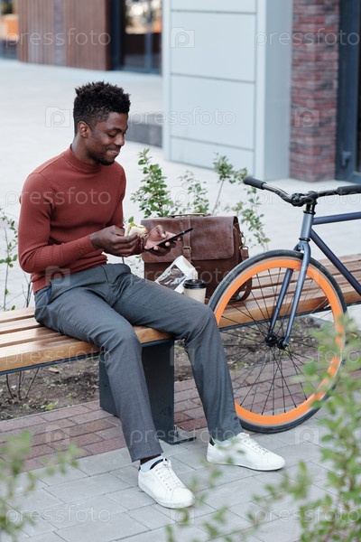 Счастливый молодой африканский бизнесмен с бутербродом, прокручивающимся в смартфоне