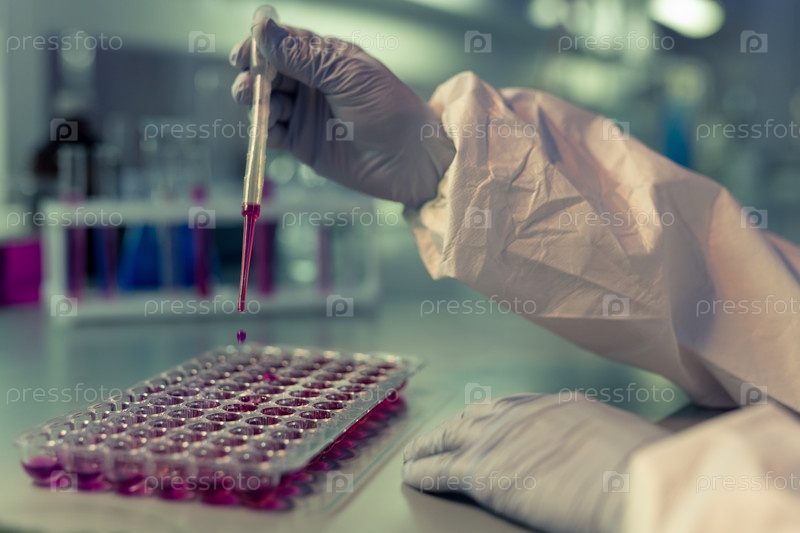 В перчатках химик сбрасывает фиолетовую жидкость в пластиковые кончики нескольких микропластин