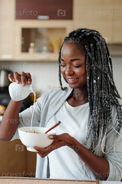 Женщина добавляет молоко в хлопья