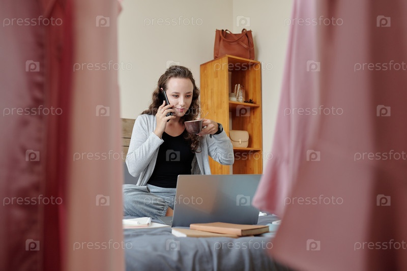 Деловая женщина разговаривает по телефону, сидя на кровати