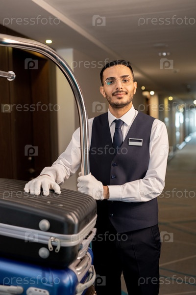 Молодой привратник в униформе и очках стоит у тележки с чемоданами гостей перед камерой