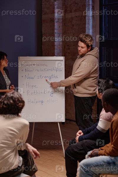 Вертикальный снимок молодого человека, стоящего с психологом перед группой и говорящим о плановых преимуществах преодоления депрессии