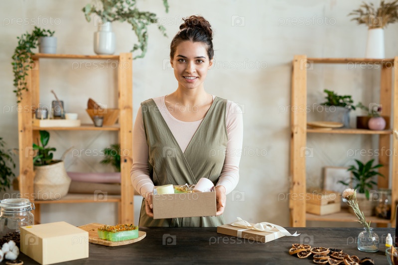 Молодая брюнетка-женщина в умной повседневной одежде, держащая открытый картонный подарочный ящик
