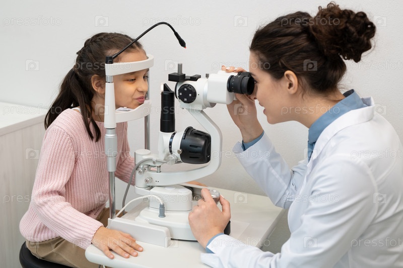 Молодой современный офтальмолог в белом халате проверяет зрение маленькой девочки