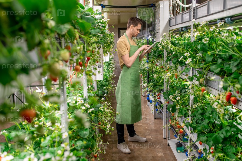 Человек в зеленом фартуке смотрит на дисплей выращивания клубники