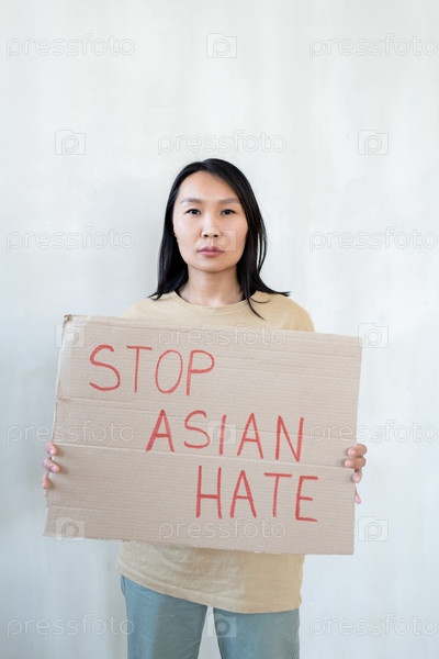 Женщина держит плакат, объявляющий о протесте против азиатской ненависти
