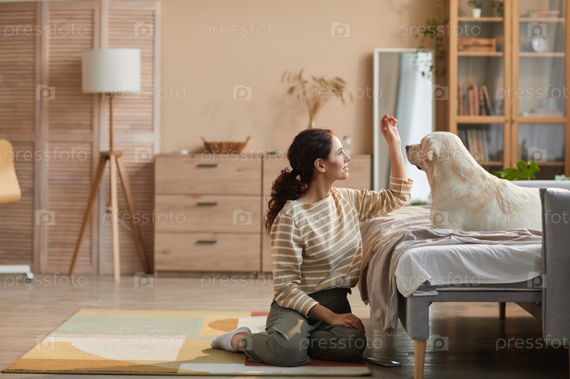 Молодая женщина тренирует собаку дома