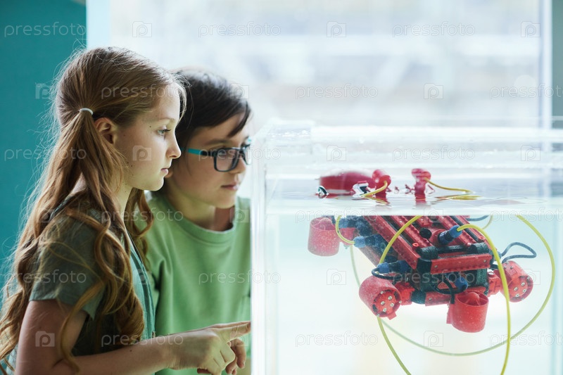 Дети играют с водяным роботом