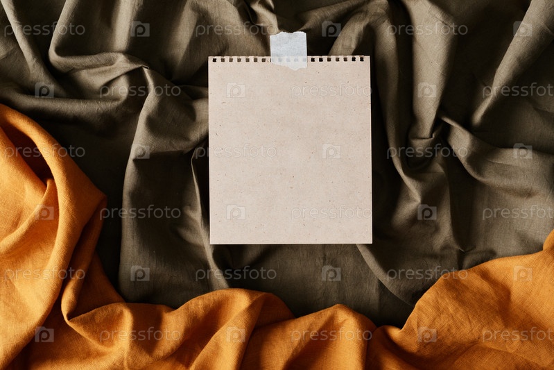 Пустой лист бумаги, прикрепленный к морщинисто-серой ткани, заметка концепции