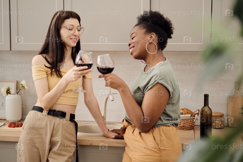 Две счастливые женщины, скандирующие со стаканами красного вина
