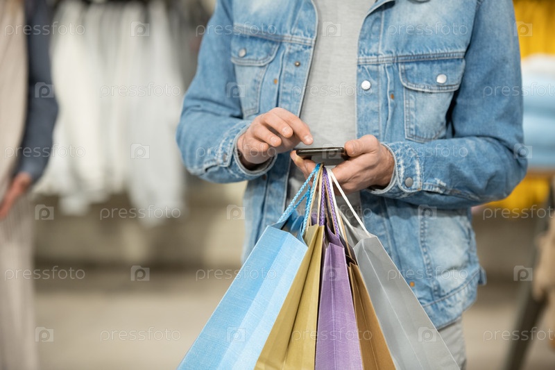 Человек, держащий телефон и кучу бумажных пакетов