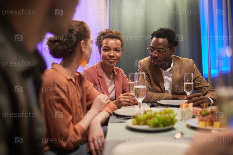 Друзья, беседующие за обеденным столом