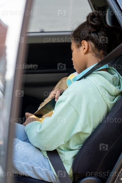 Боковой вид смешанной расы школьницы, застегивающей ремень безопасности