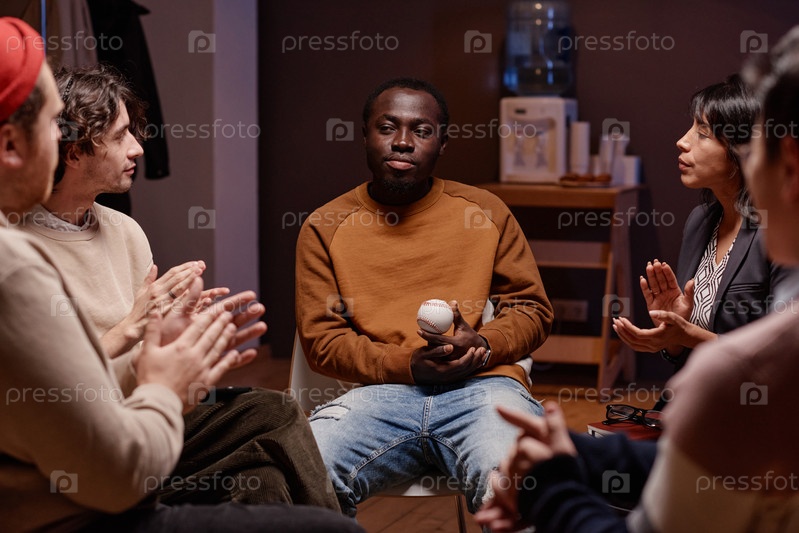 Горизонтальный снимок психолога и клиентов, хлопающих в ладоши молодому человеку после знакомства с ним